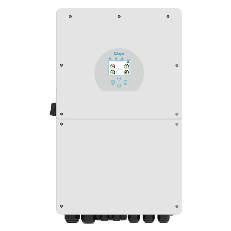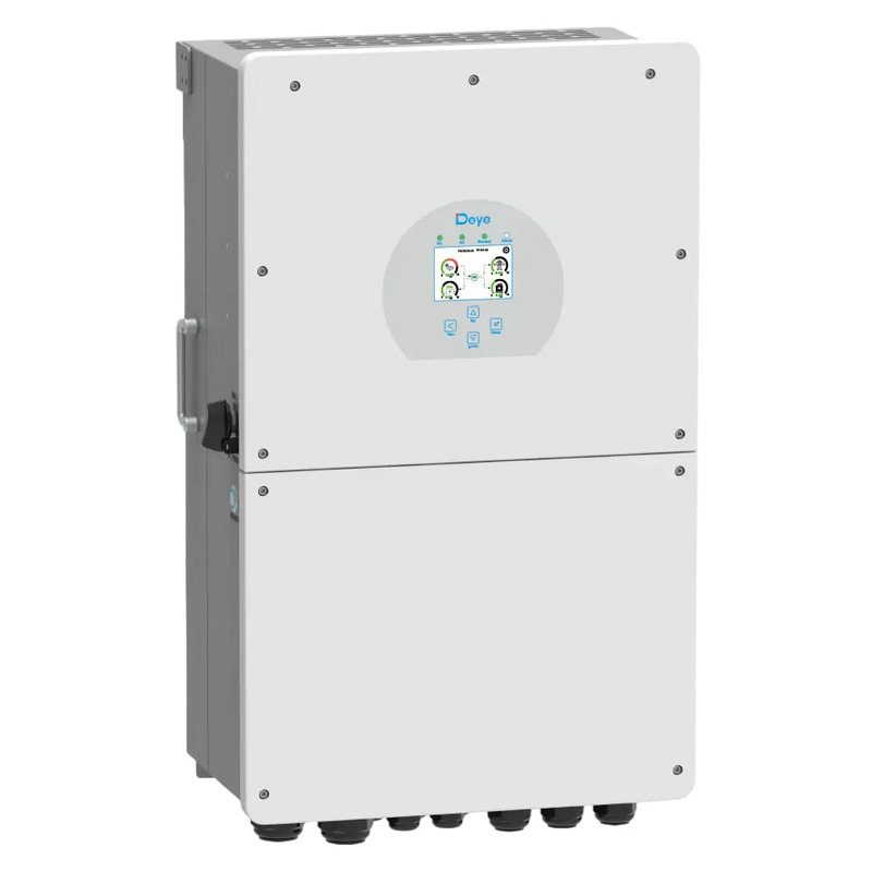 Deye SUN-12K-SG01LP1-EU - гибридный инвертор с возможностью работы как в сетевой, так и в автономной конфигурации. Оснащен цветным сенсорным ЖК-экраном и высокой степенью защиты IP65.